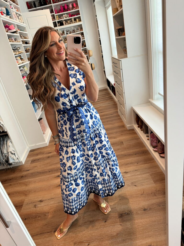 In a small belted blue white maxi from Abercrombie- fits TTS.