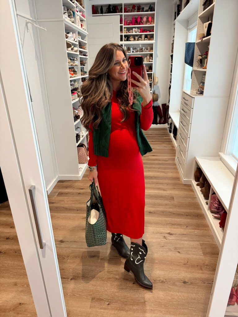 In a size large in dress at 39 weeks pregnant with ankle cowboy boots – fits tts. Shop the items here!