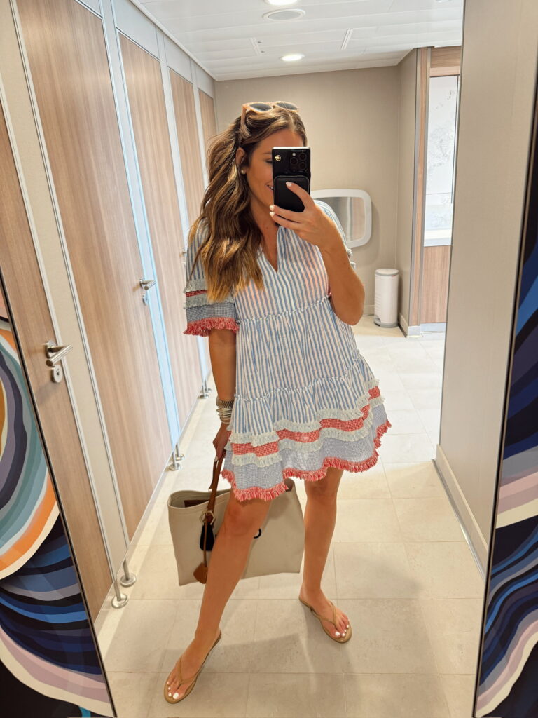In a small Tuckernuck dress and accessories for cruise/resort outfit – all fits TTS.
