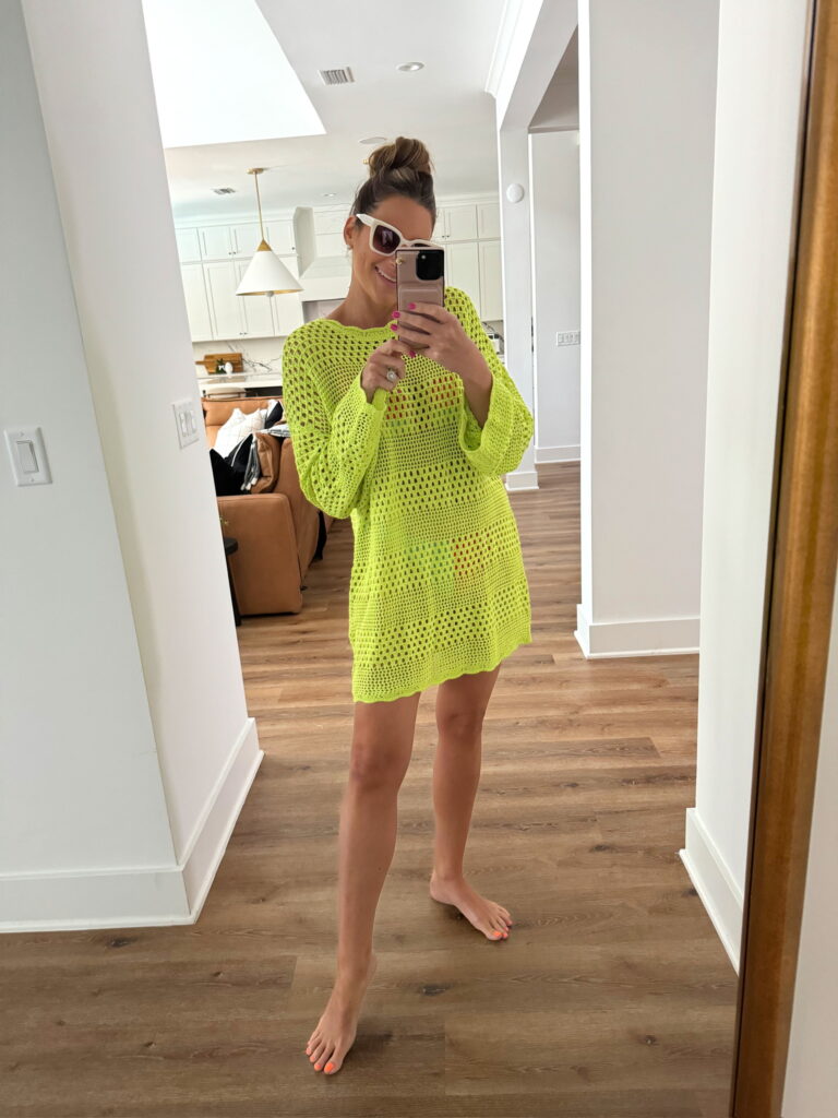 In a medium green crochet swim coverup dress and sunglasses for pool/beach/resort outfit – fits TTS.
