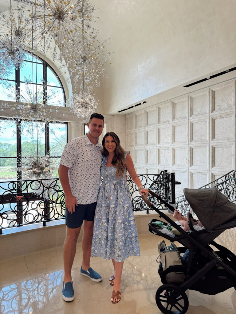 In a small Ellie nap dress, sandals and accessories- fits tts. Sean’s outfit and Storm’s stroller and accessories linked too! Shop the items here!