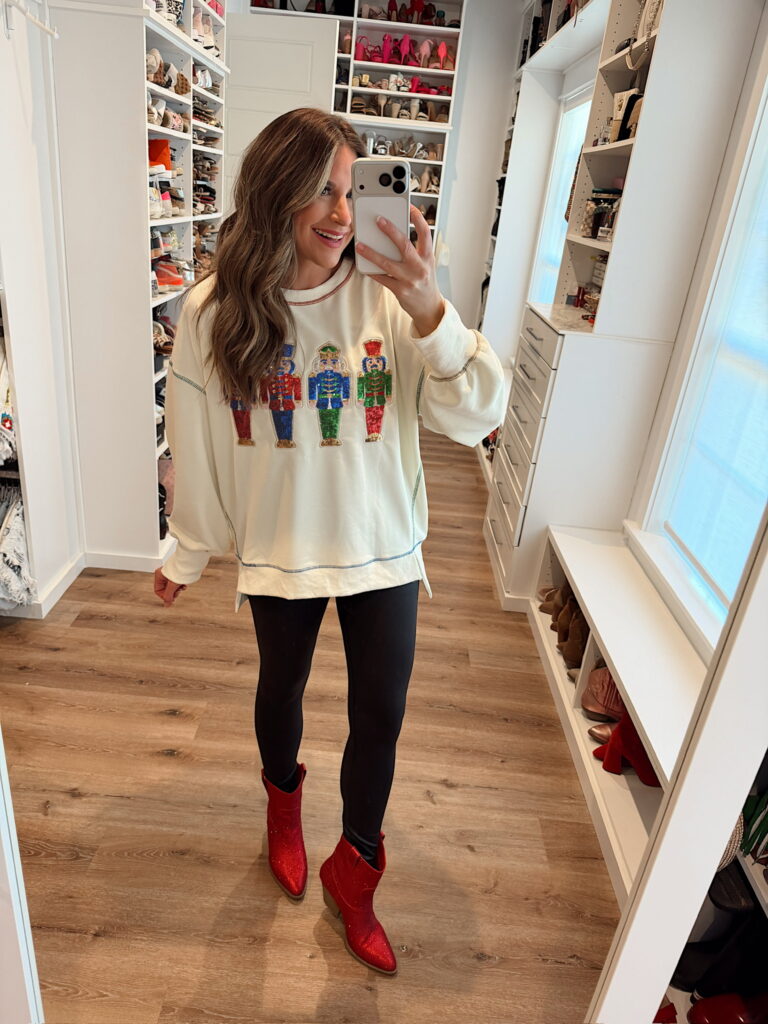 In an xl sequin nutcracker sweatshirt, small faux leather look leggings, boots and accessories- fits tts. Shop the items here!