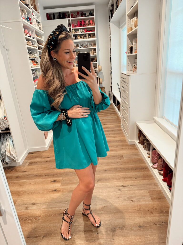 In a medium off shoulder oversized babydoll dress, gladiator sandals and accessories – all fits TTS. Accessories Brianna Cannon official NFL Collection and Bauble Bar NFL collection.