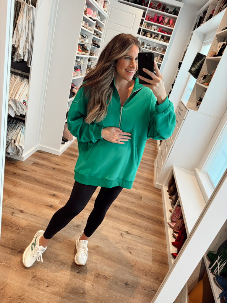 In a large half zip sweatshirt, small maternity leggings and sneakers – all fits tts. Shop the items here!