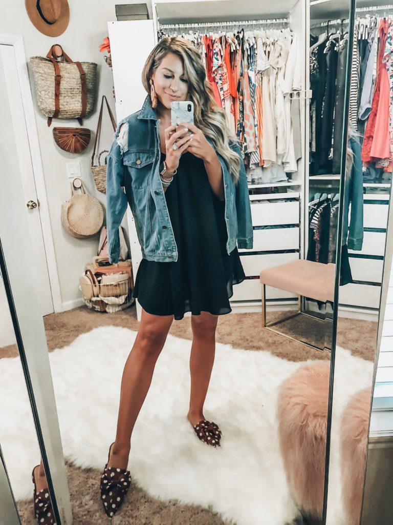 Buddy Love Heidi Denim Jacket wearing size small with Bonita Dress wearing size medium with Polka Dot Flats and similar statement earrings