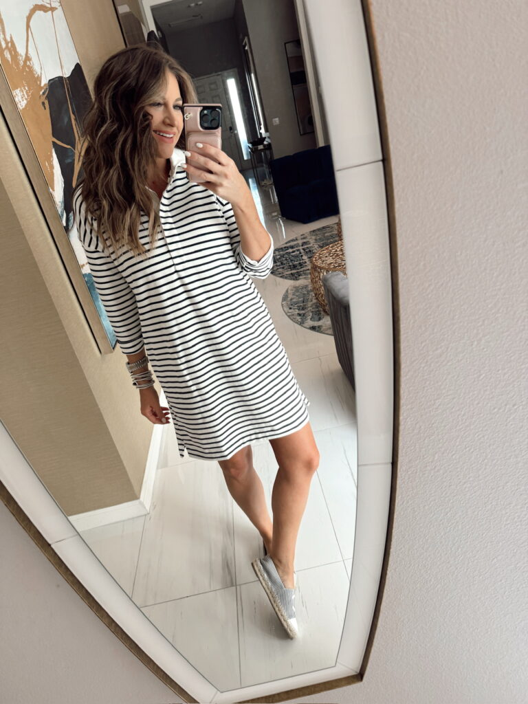 In a medium striped polo dress, espadrilles and accessories for spring – all fits TTS.