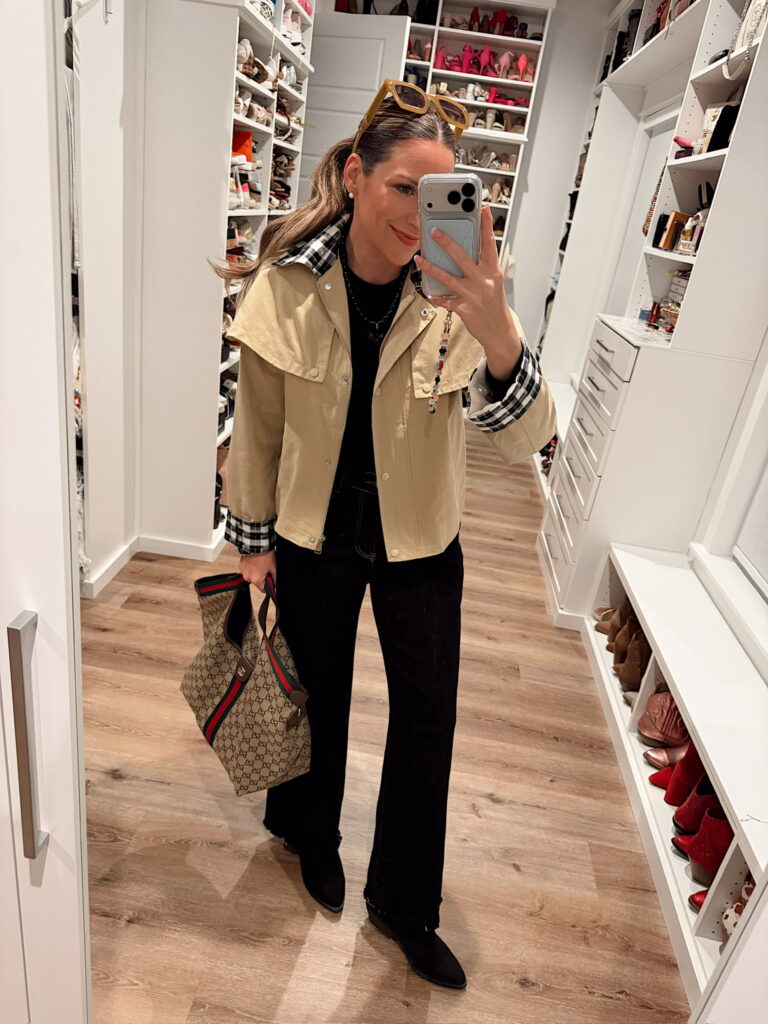 In a small gingham trim khaki cropped coat, medium bodysuit, size 10 jeans, ankle boots and accessories – fits tts. Shop the items here!