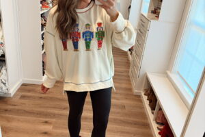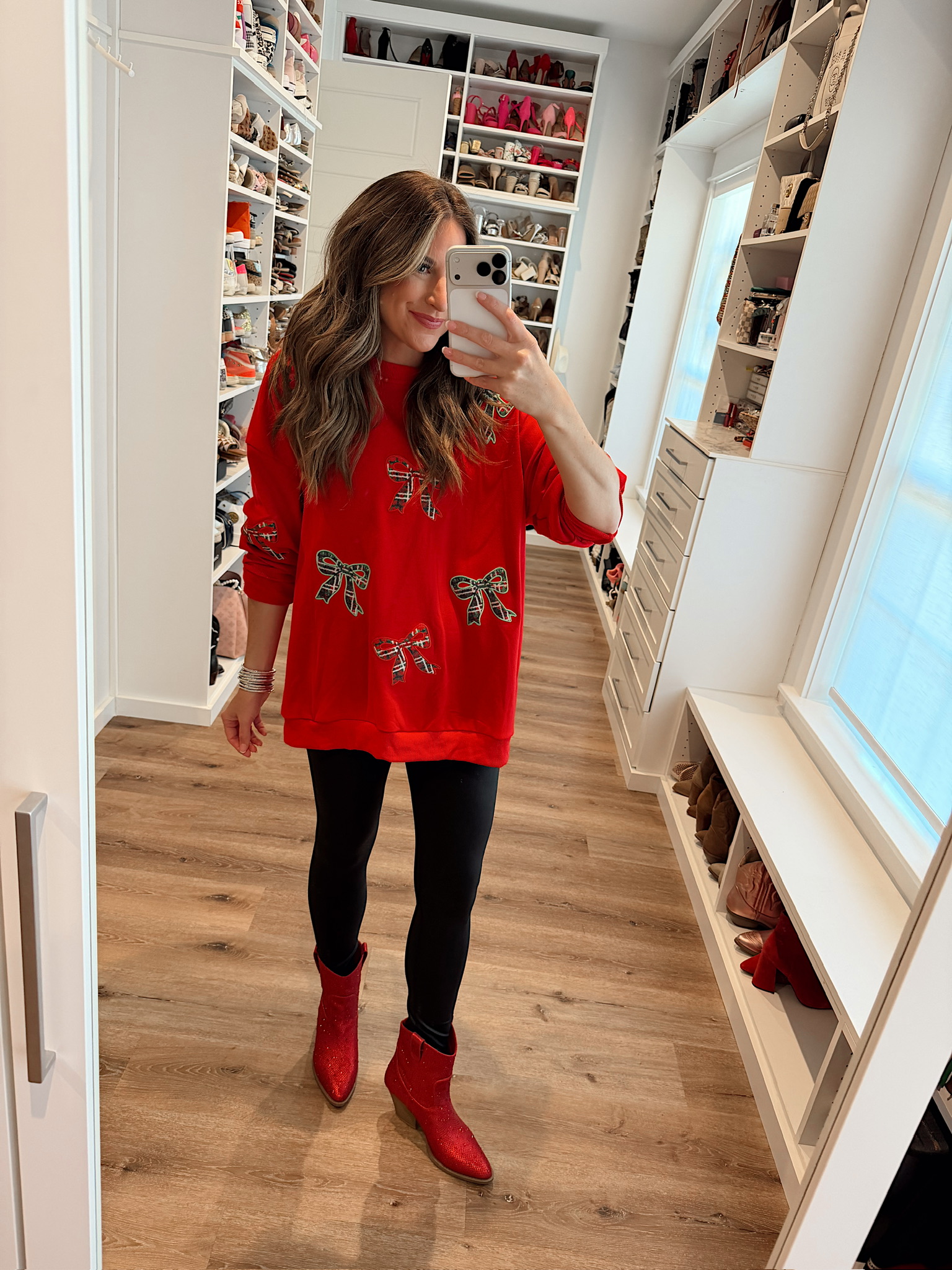 In an xl plaid bow sweatshirt, small faux leather look leggings, boots and accessories- fits tts. Shop the items here!