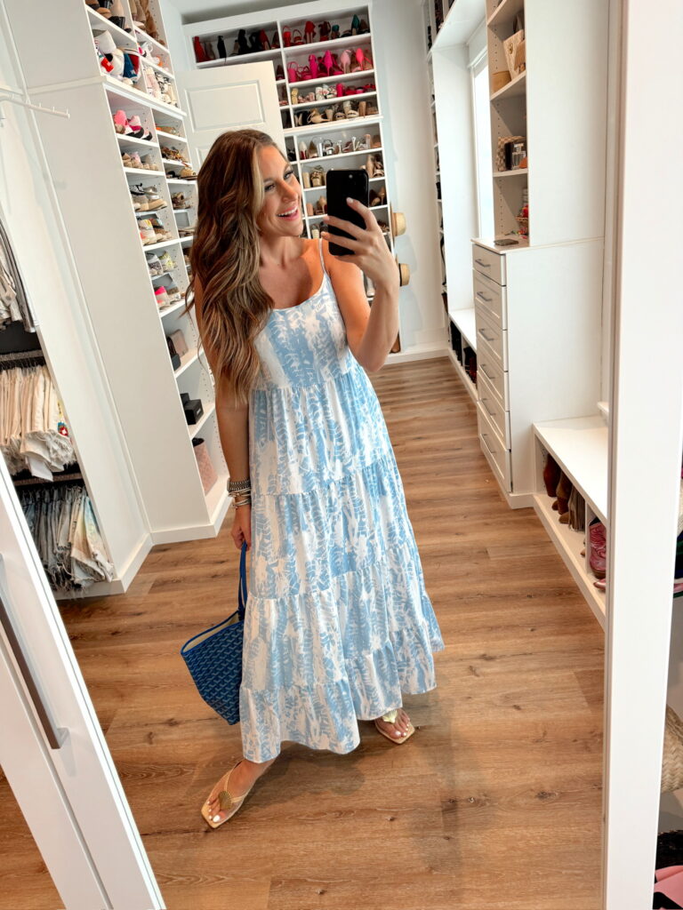 In a small smocked top midi dress, sunglasses, sandals and accessories – all fits TTS.
